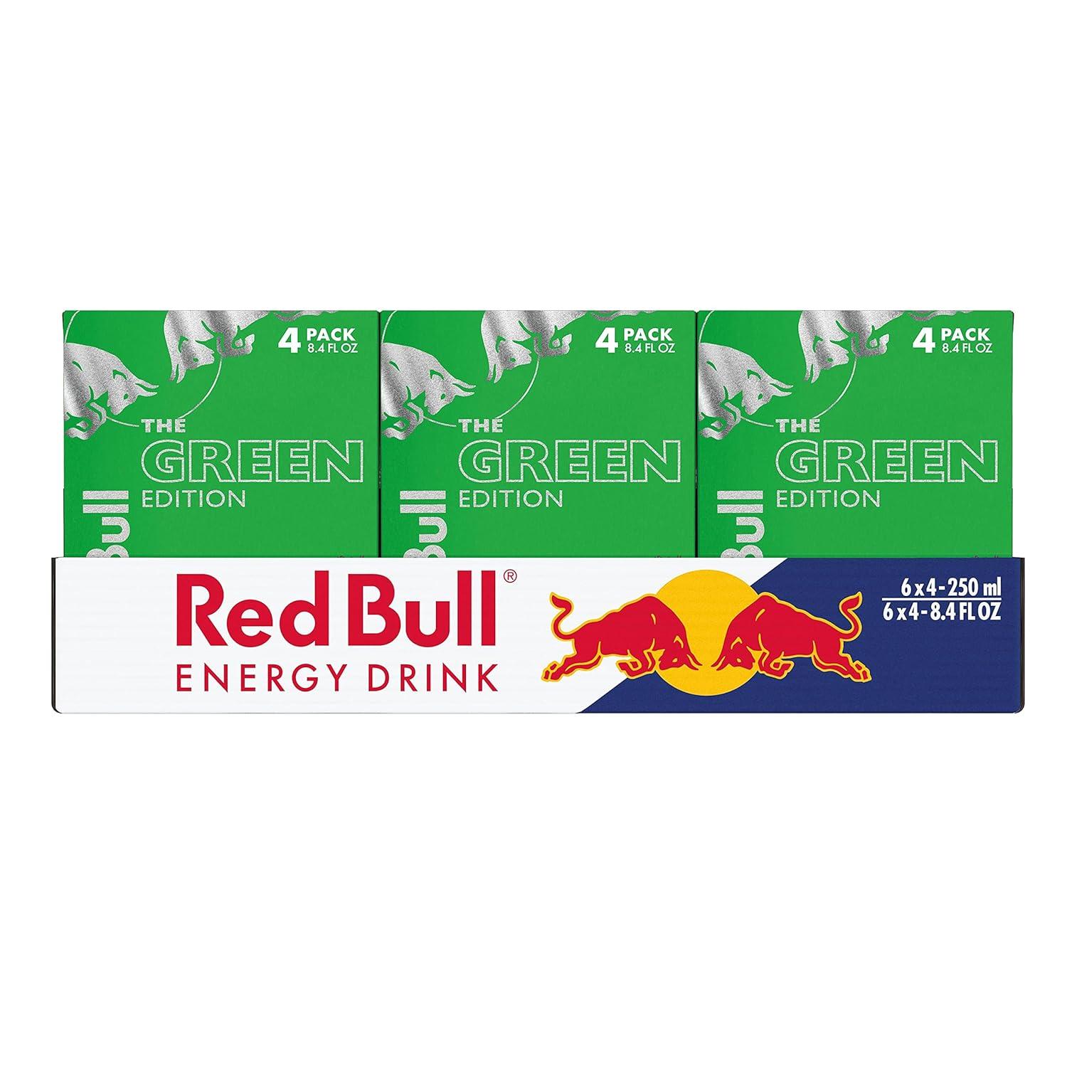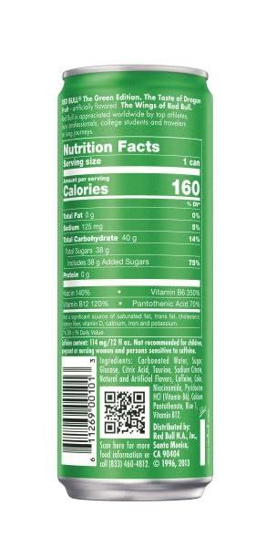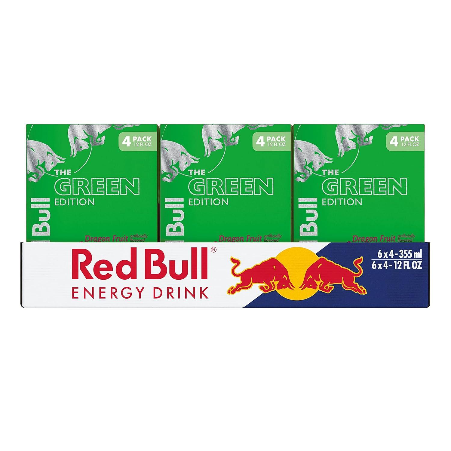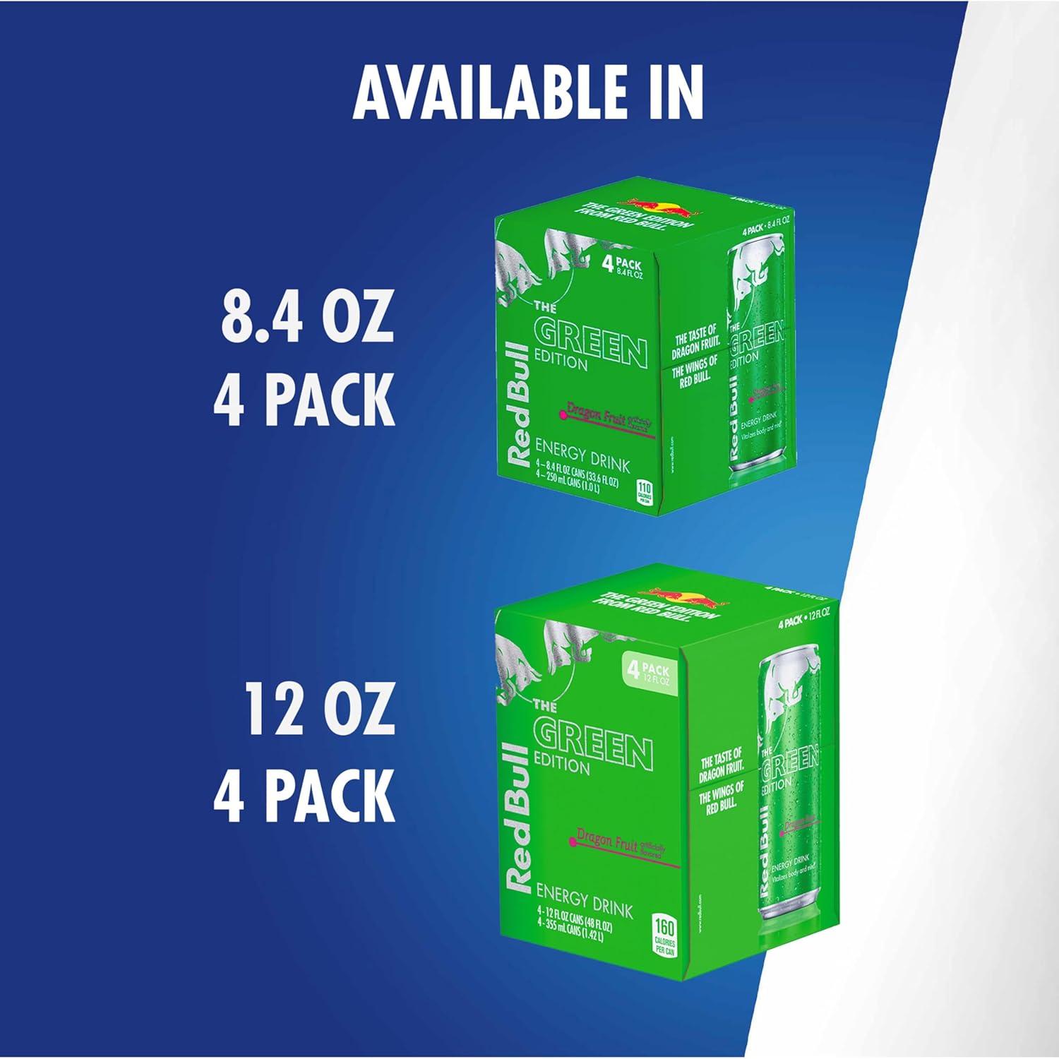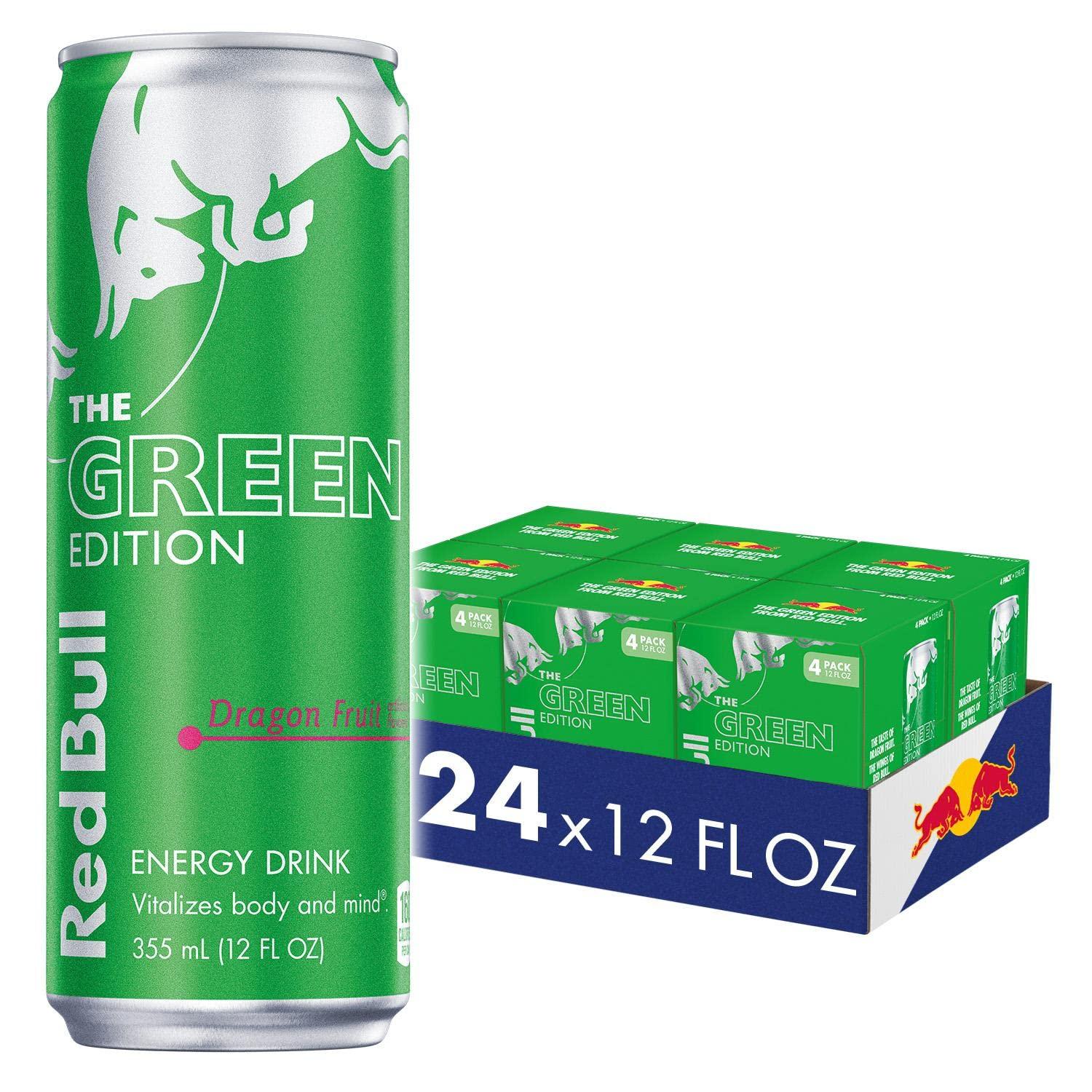 This Red Bull Green Edition features the exotic taste of Dragon Fruit. This lightly carbonated beverage is enjoyed worldwide by fitness enthusiasts, athletes, gamers, students and travelers. A refreshing can of Red Bull makes an excellent partner for busy, active lifestyles. Each 8.4 fl oz can contains 80mg of caffeine per serving (about the same amount as a home-brewed cup of coffee) and 27g of sugar (comparable to sugar levels found in apple juice). It also includes Taurine, an amino acid naturally occurring in the human body, and B-group vitamins B6, B12, Niacin (B3) and Pantothenic Acid (B5). Available in 4-packs, 12-packs, 24-packs and Variety Packs. Comes in aluminum cans that can be recycled over and over. Always check can labels for the most updated product nutritional and ingredient information. Calcium and sugars values declared on labels may vary slightly depending on production locations. Always check can labels for most updated product nutritional and ingredient information. Calcium and sugars values declared on labels may vary slightly depending on production locations.