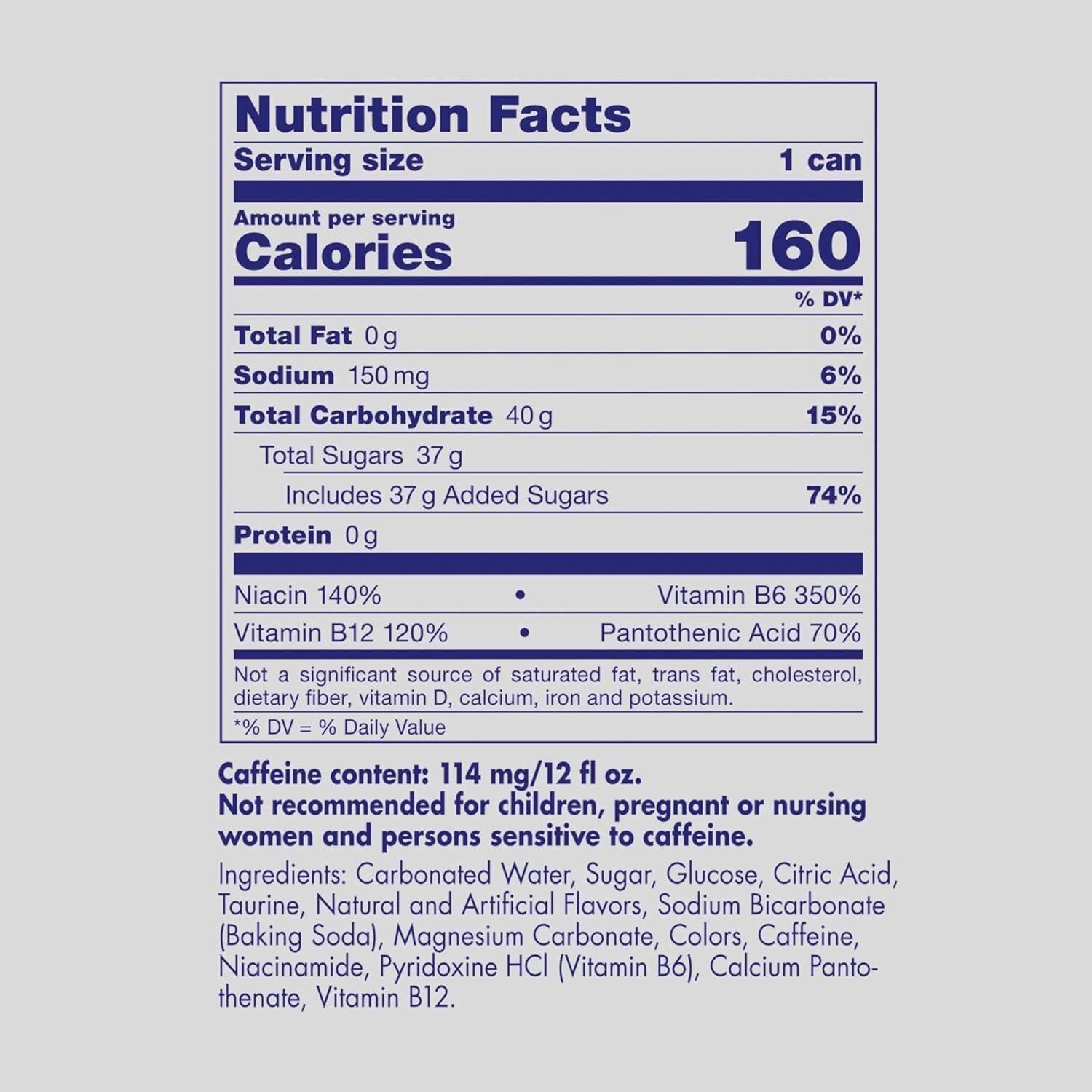 Each 8.4 fl oz can contains 110 calories, 80mg of caffeine which helps to increase alertness, plus 27g of real sugar similar to a glass of apple juice of the same size